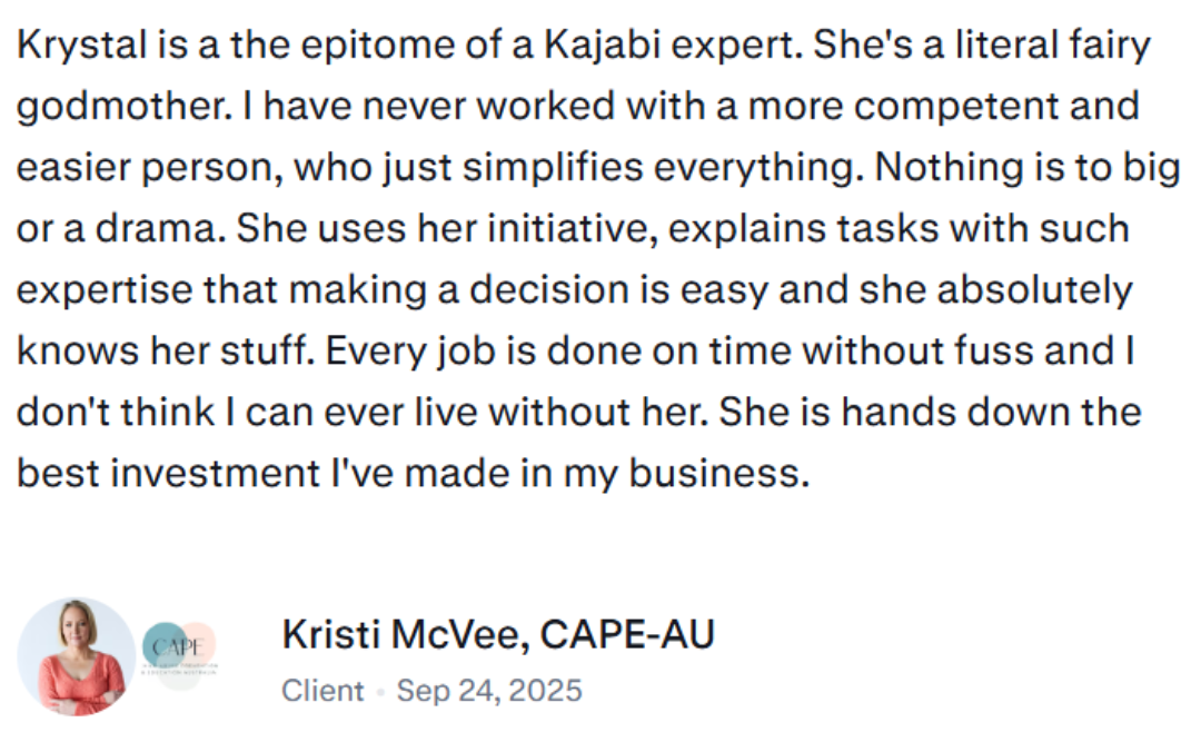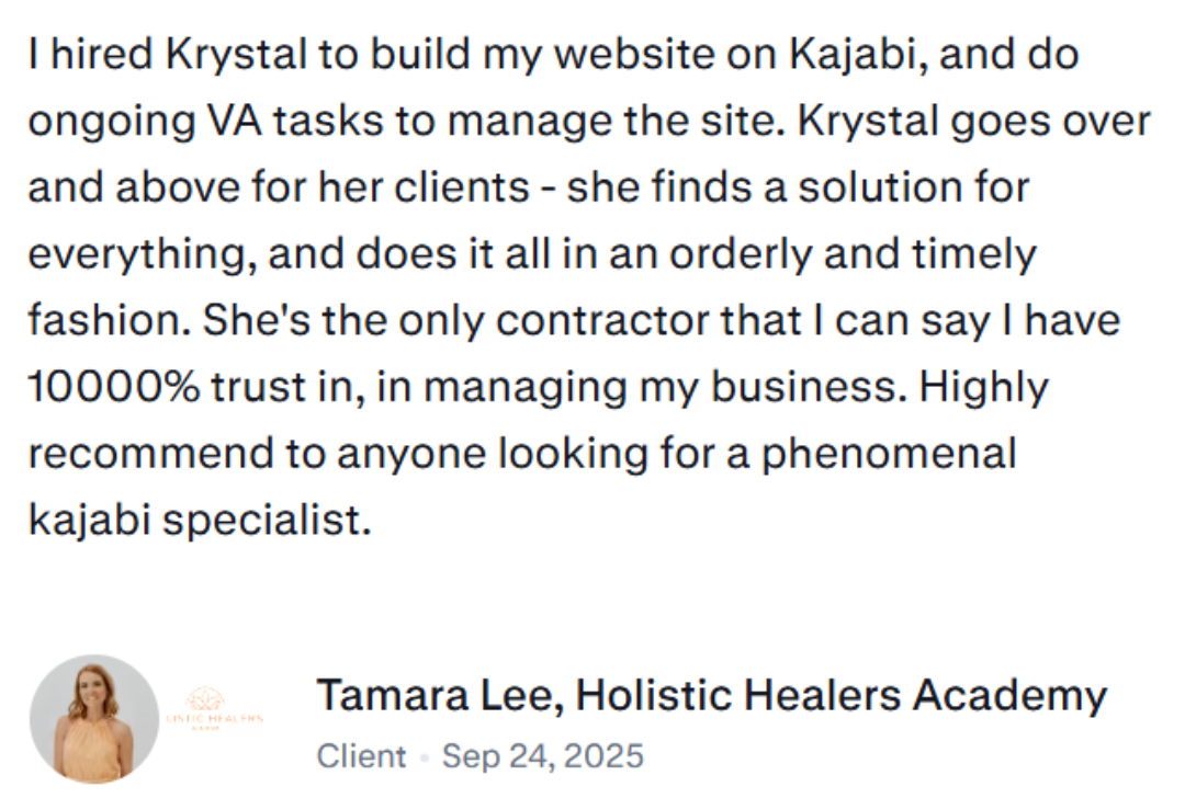 I can't express how grateful I am for the invaluable assistance Krystal provided. Her expertise in navigating Kajabi is truly remarkable. Krystal's approach is a breath of fresh air. She's not only easy to work with but also gentle and incredibly knowledgeable. Krystal's thoughtful add-ons, like her whimsical confetti custom code on my thank you page, added a touch of magic to the entire experience. But beyond her technical skills, what truly sets Krystal apart is her ability to make you feel like you're working with a friend who's dedicated to helping you clarify your vision and bringing it to life. I couldn't have asked for a better partner on this journey. Thank you, Krystal!