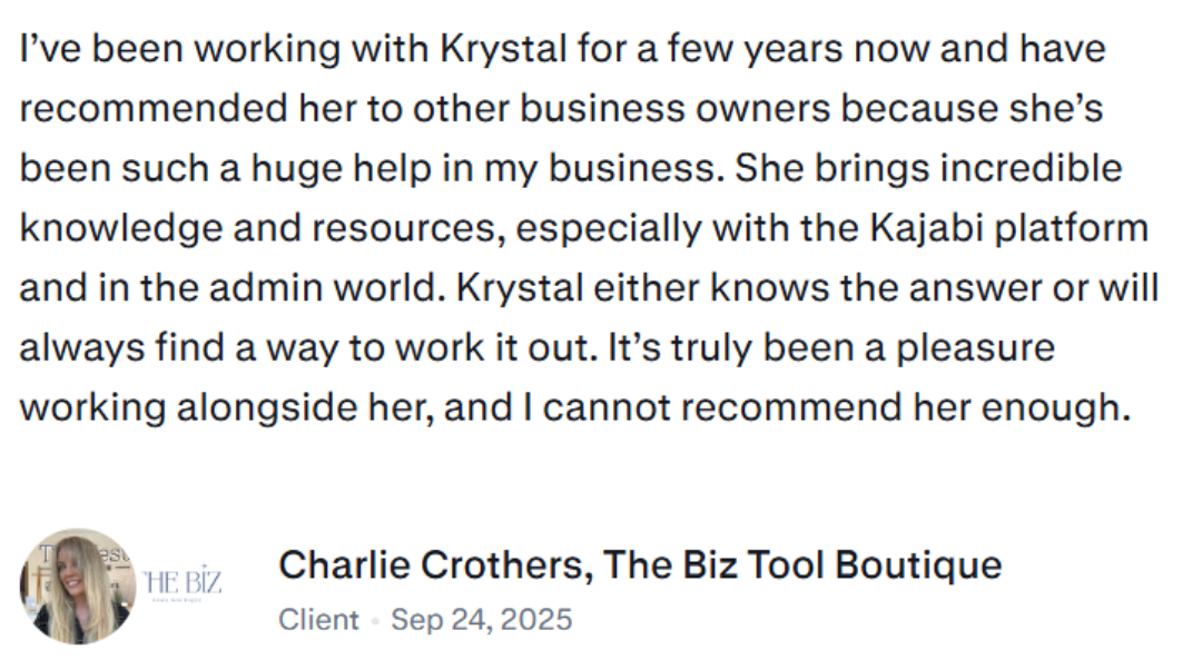 From the start, Krystal had the ability to help me gain clarity in my business needs. She was able to understand the noise in my mind and simplify everything with her knowledge. She is incredible at coming up with solutions when I felt stuck. I can't even explain how much Krystal has helped me in my business. I am constantly learning from her and wouldn't be without her in my life.